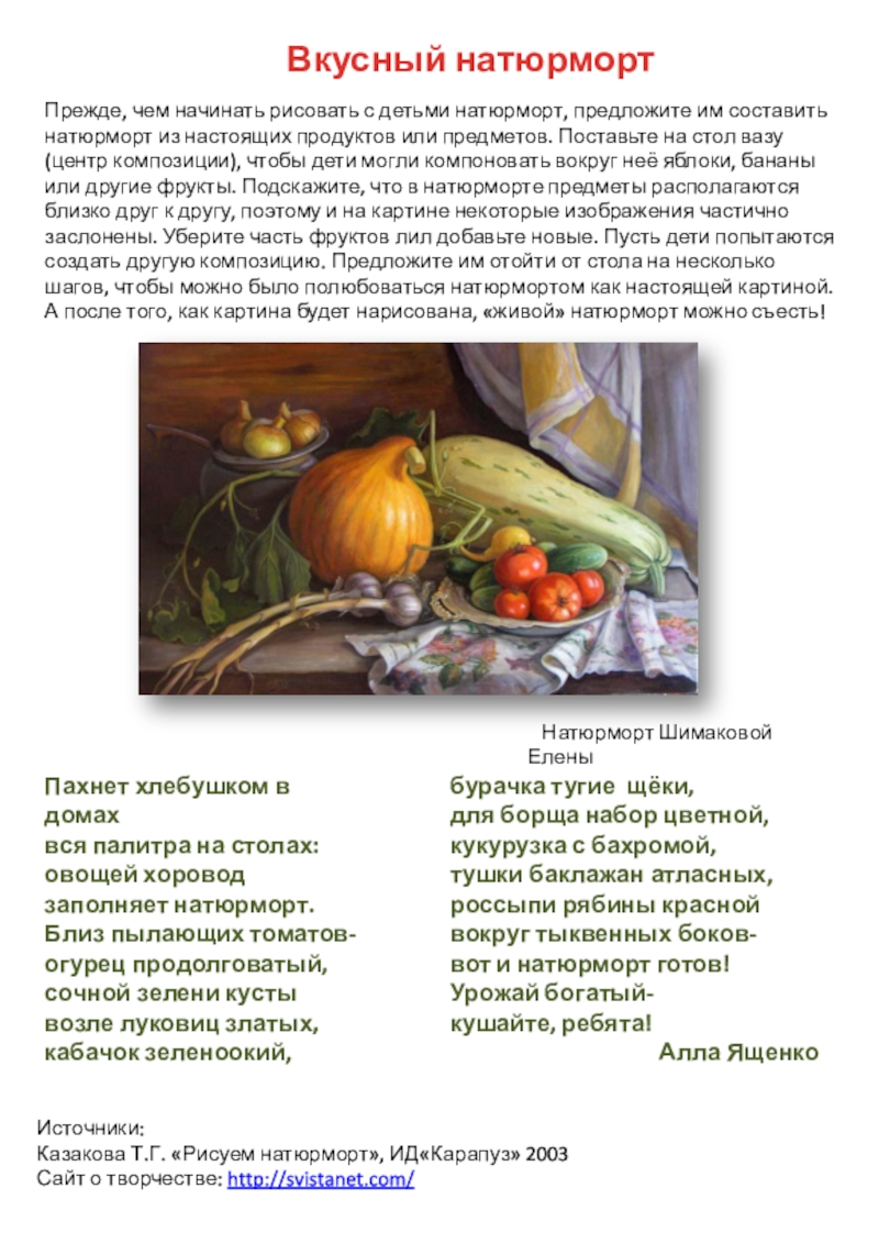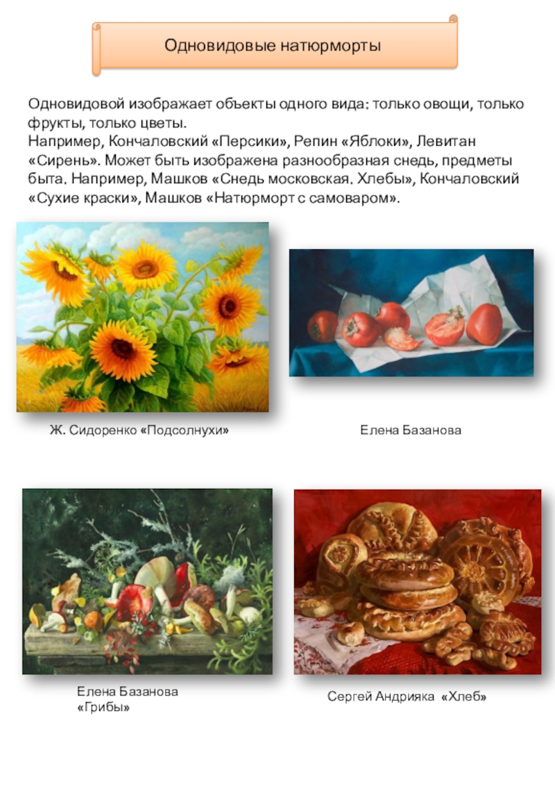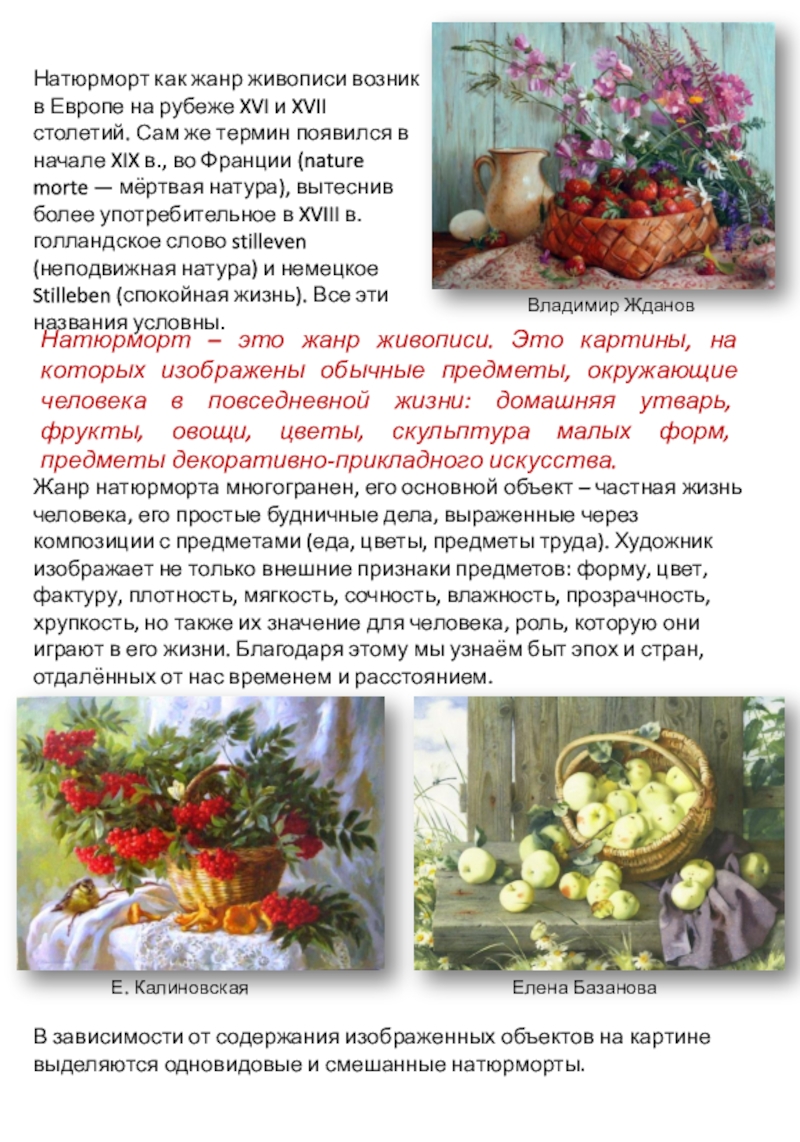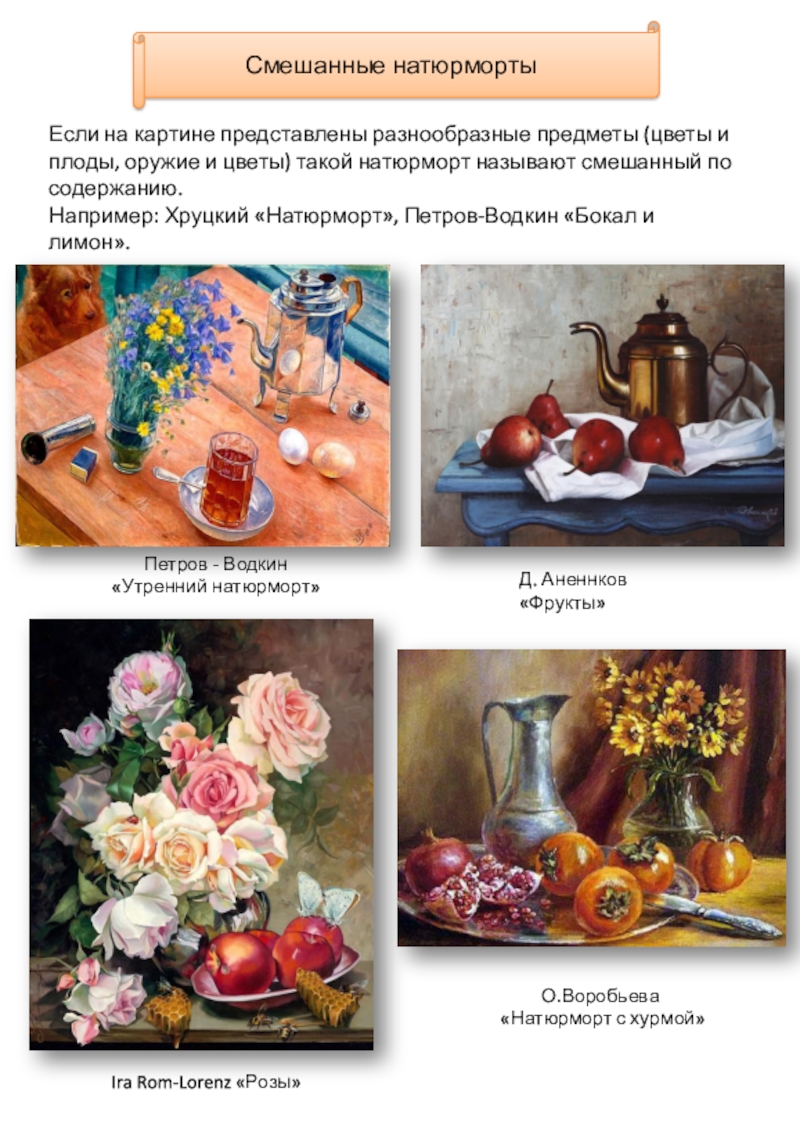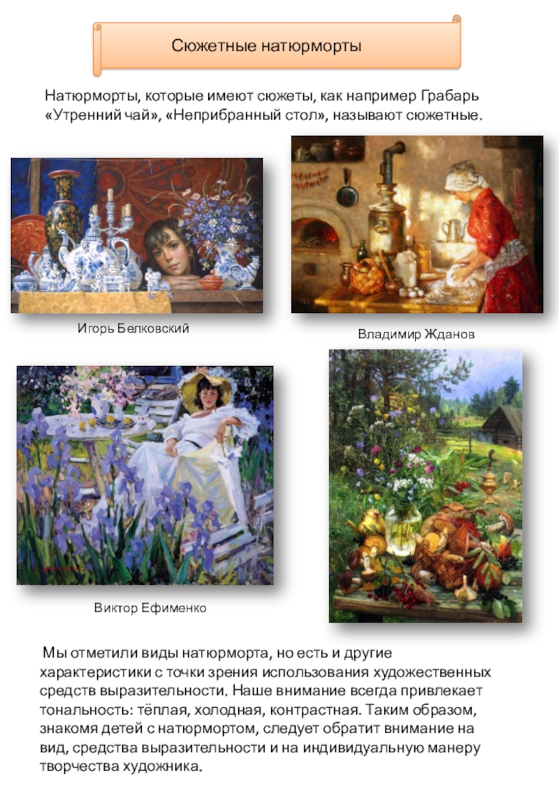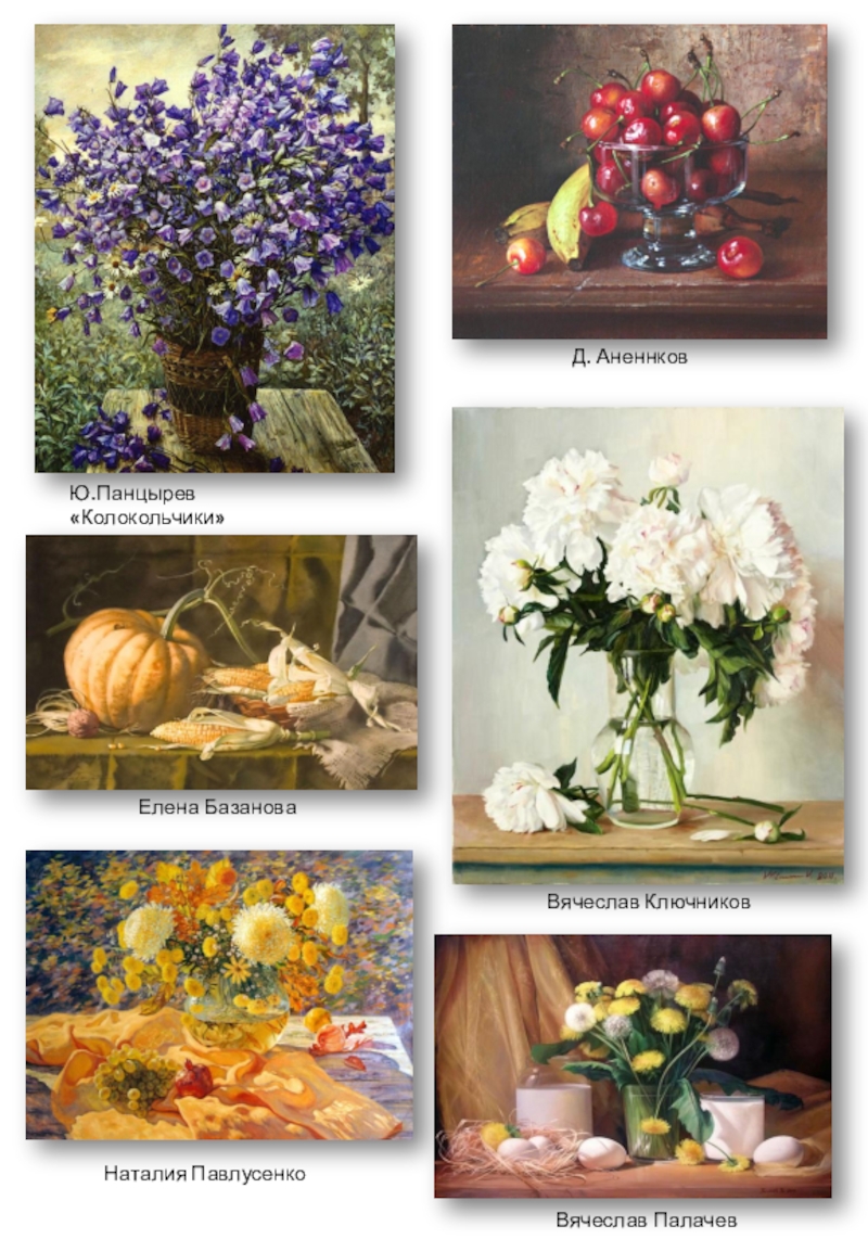 Жанр натюрморта многогранен, его основной объект – частная жизнь человека, его простые будничные дела, выраженные через композиции с предметами (еда, цветы, предметы труда). Художник изображает не только внешние признаки предметов: форму, цвет, фактуру, плотность, мягкость, сочность, влажность, прозрачность, хрупкость, но также их значение для человека, роль, которую они играют в его жизни. Благодаря этому мы узнаём быт эпох и стран, отдалённых от нас временем и расстоянием.