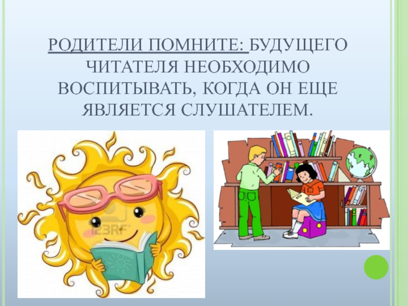 Слайд 10РОДИТЕЛИ ПОМНИТЕ: БУДУЩЕГО ЧИТАТЕЛЯ НЕОБХОДИМО ВОСПИТЫВАТЬ, КОГДА ОН ЕЩЕ ЯВЛЯЕТСЯ СЛУШАТЕЛЕМ.