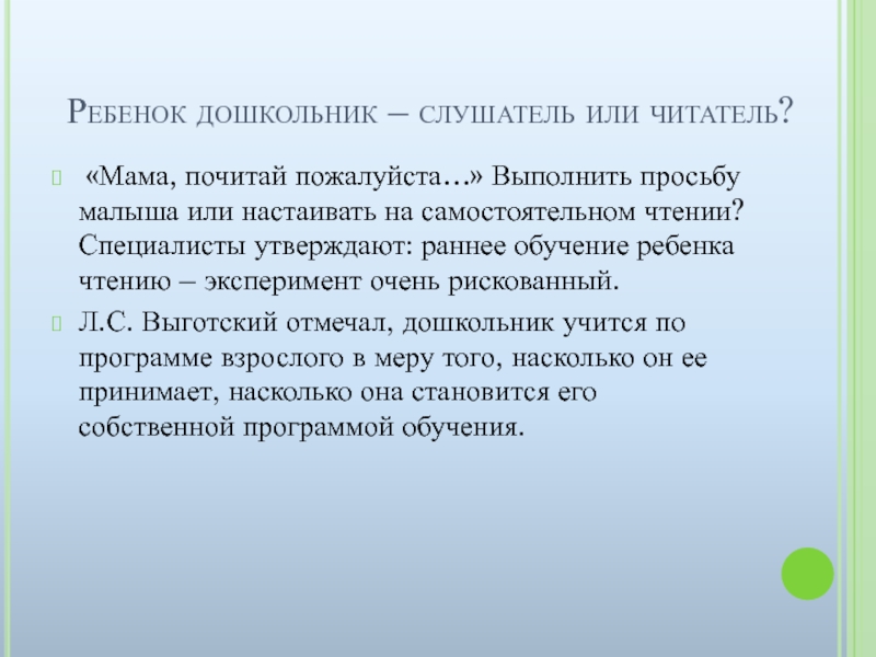 Л.С. Выготский отмечал, дошкольник учится по программе взрослого в меру того, насколько он ее принимает, насколько она становится его собственной программой обучения.
