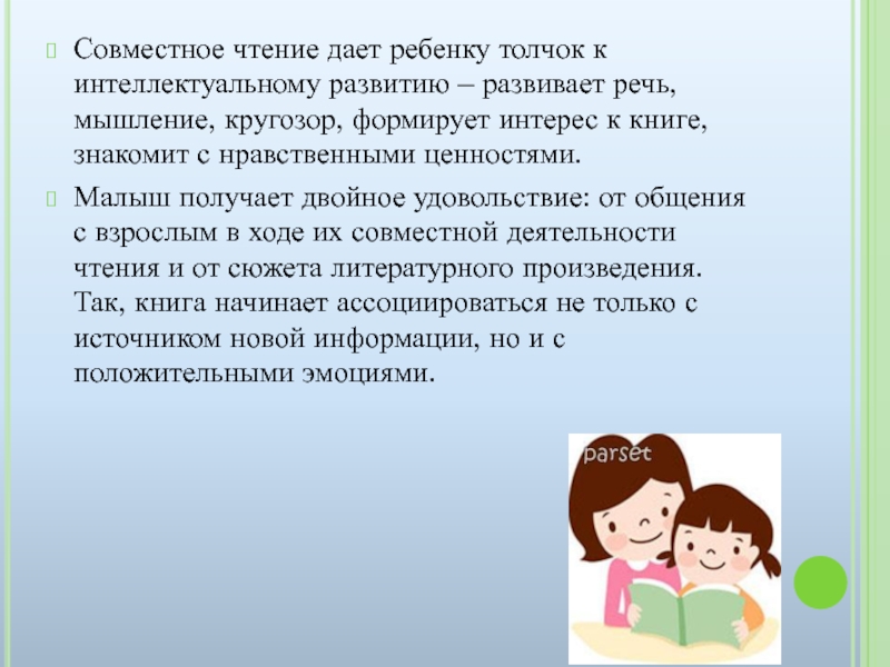 Совместное чтение дает ребенку толчок к интеллектуальному развитию – развивает речь, мышление, кругозор, формирует интерес к книге,