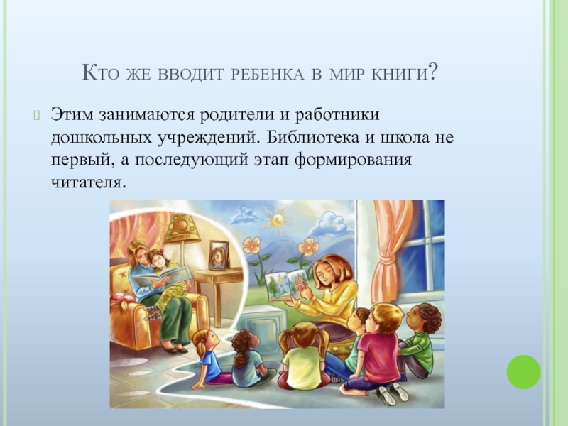 Кто же вводит ребенка в мир книги? Этим занимаются родители и работники дошкольных учреждений. Библиотека и школа