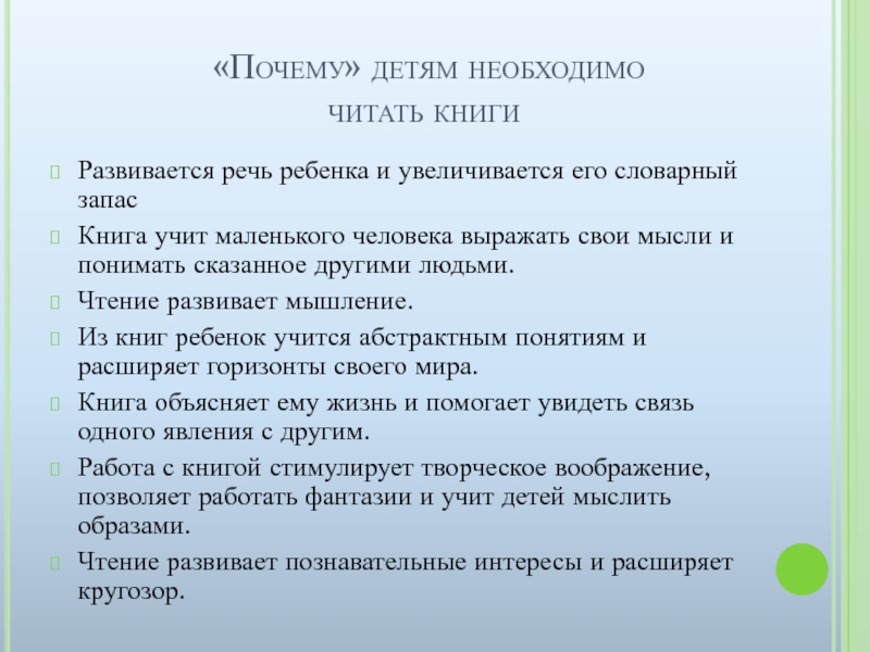 «Почему» детям необходимо  читать книгиРазвивается речь ребенка и увеличивается его словарный запасКнига учит маленького человека