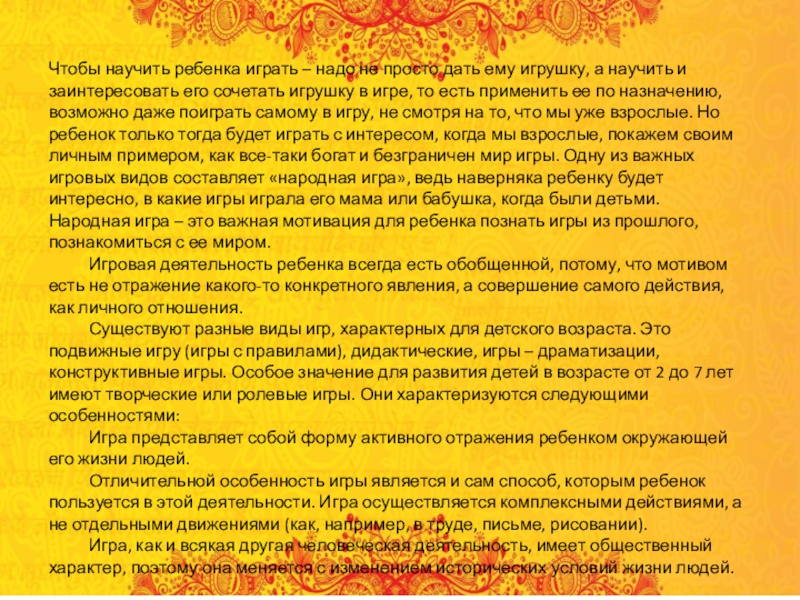 а научить и заинтересовать его сочетать игрушку в игре, то есть применить ее по назначению, возможно даже поиграть самому в игру, не смотря на то, что мы уже взрослые. Но ребенок только тогда будет играть с интересом, когда мы взрослые, покажем своим личным примером, как все-таки богат и безграничен мир игры. Одну из важных игровых видов составляет «народная игра», ведь наверняка ребенку будет интересно, в какие игры играла его мама или бабушка, когда были детьми. Народная игра – это важная мотивация для ребенка познать игры из прошлого, познакомиться с ее миром.