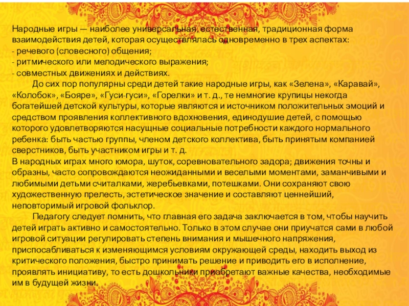Слайд 4Народные игры — наиболее универсальная, естественная, традиционная форма взаимодействия детей, которая
