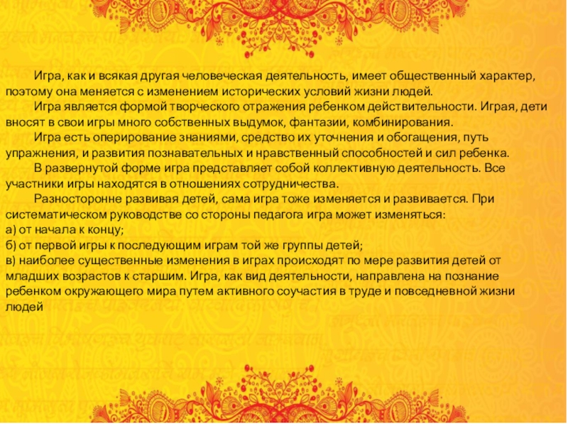 Слайд 3 Игра, как и всякая другая человеческая деятельность, имеет общественный характер, поэтому