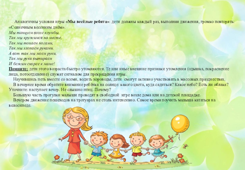 Слайд 10 Аналогичны условия игры «Мы весёлые ребята»: дети должны каждый