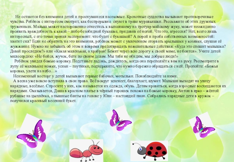 Слайд 7 Не остаются без внимания детей и проснувшиеся насекомые.