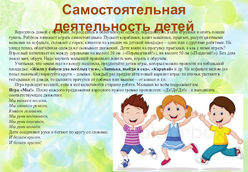 облегчённую одежду, передохнули, взяли игрушки и опять пошли гулять. Ребёнок начинает играть самостоятельно. Пускает кораблики, возит машинки, прыгает, рисует цветными мелками на асфальте, съезжает с горки, качается на качелях на детской площадке – один или с другими ребятами. На улице тепло, облегчённая одежда не сковывает движений. Дети взяли на прогулку прыгалки, а как с ними играть? Взрослый натягивает их между деревьями на высоте 10 см. («Перешагивай!»), на высоте 50 см («Подлезай!»). Без дела лежат мяч, обруч. Надо научить малышей правильно ловить мяч, играть с обручем.