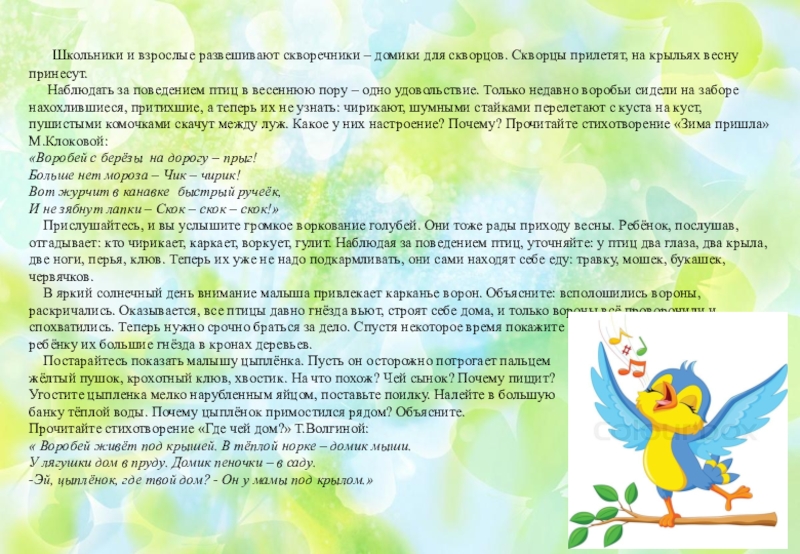 скворцов. Скворцы прилетят, на крыльях весну принесут.
