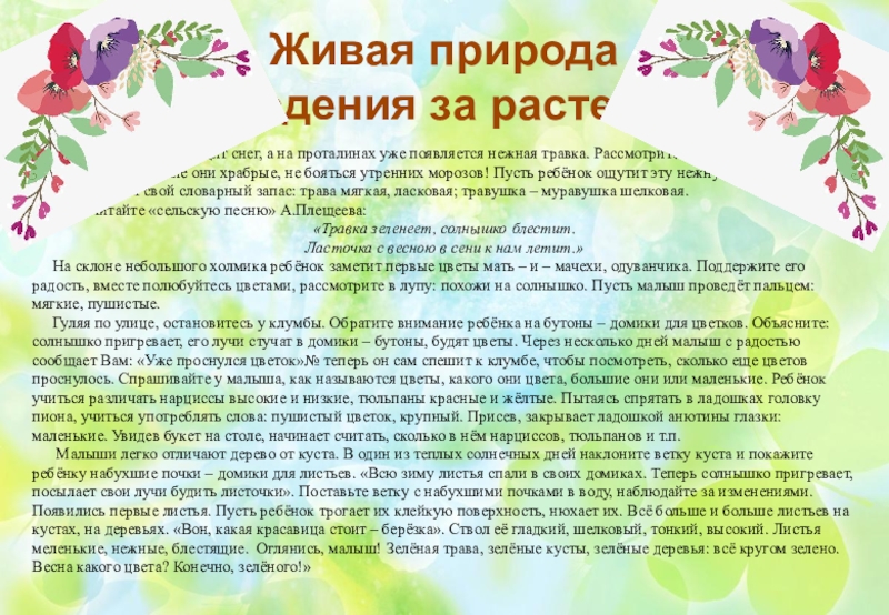 Пусть он рассмотрит цветы на клумбе, вспомнит их названия, скажет какого они цвета, большие они или маленькие. Покажите ребёнку цветущие фруктовые деревья, спросите, какие плоды на них появятся. Можно заглянуть в парник, постоять у огородных грядок – и везде объяснения необходимо перемежать с воспоминаниями.
