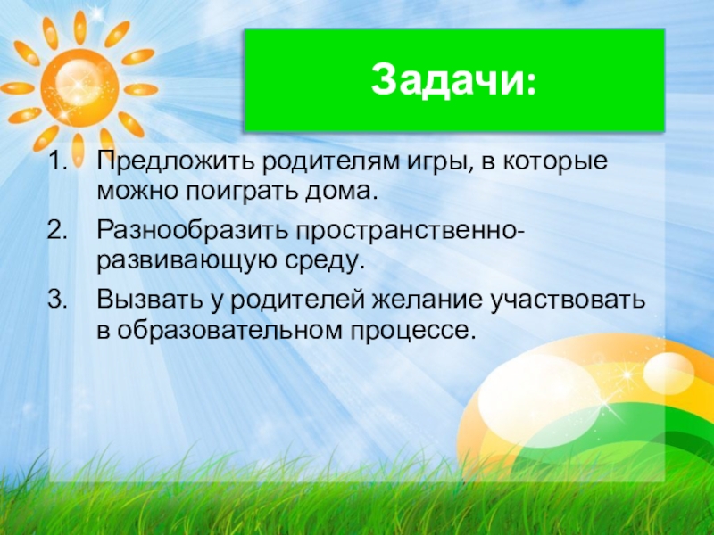 Задачи:Предложить родителям игры, в которые можно поиграть дома.Разнообразить пространственно-развивающую среду.Вызвать у родителей желание участвовать в образовательном процессе.