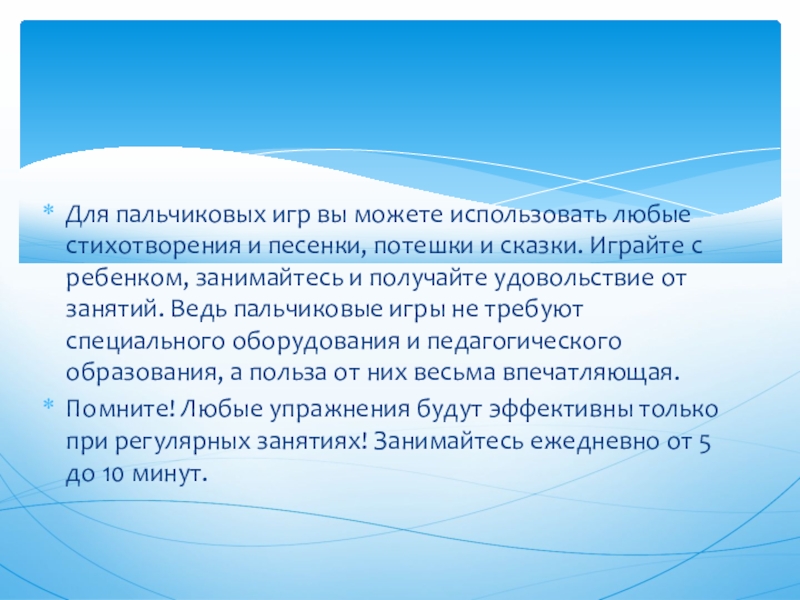 Слайд 18Для пальчиковых игр вы можете использовать любые стихотворения и песенки, потешки