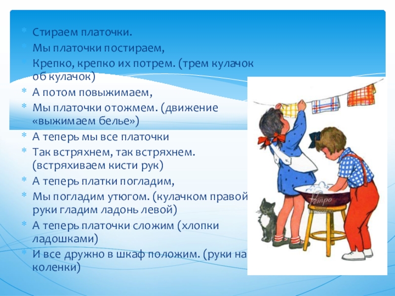 Мы платочки отожмем. (движение «выжимаем белье»)