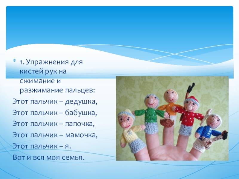 Слайд 121. Упражнения для кистей рук на сжимание и разжимание пальцев: