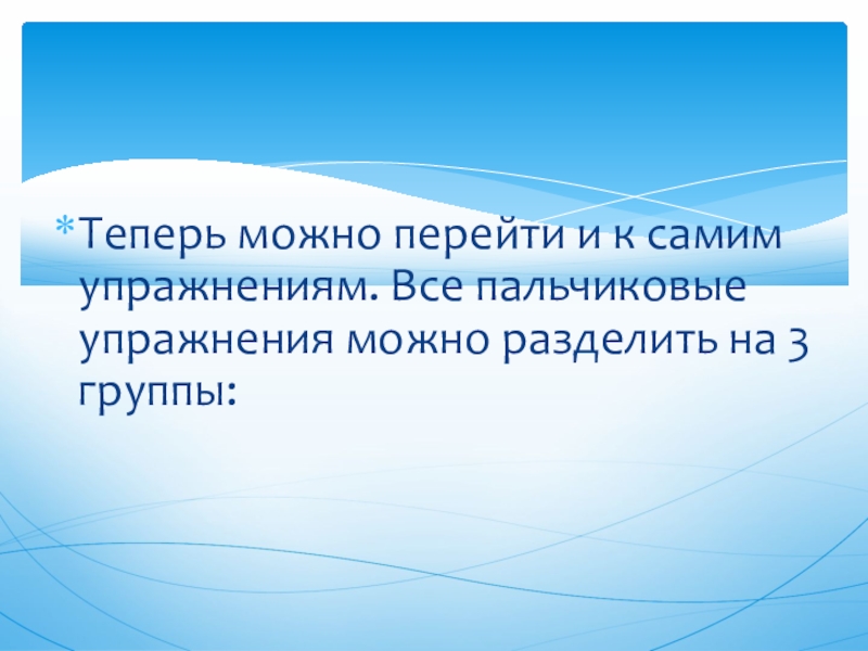 Слайд 11Теперь можно перейти и к самим упражнениям. Все пальчиковые упражнения можно