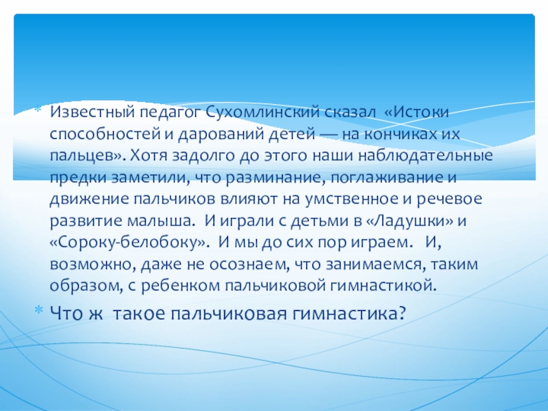 Слайд 2Известный педагог Сухомлинский сказал «Истоки способностей и дарований детей — на