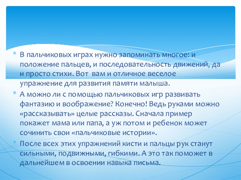 Слайд 8В пальчиковых играх нужно запоминать многое: и положение пальцев, и последовательность