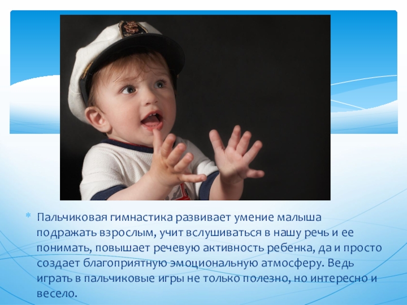 Слайд 6Пальчиковая гимнастика развивает умение малыша подражать взрослым, учит вслушиваться в нашу