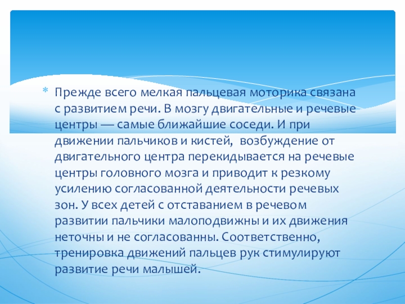 Слайд 5Прежде всего мелкая пальцевая моторика связана с развитием речи. В мозгу