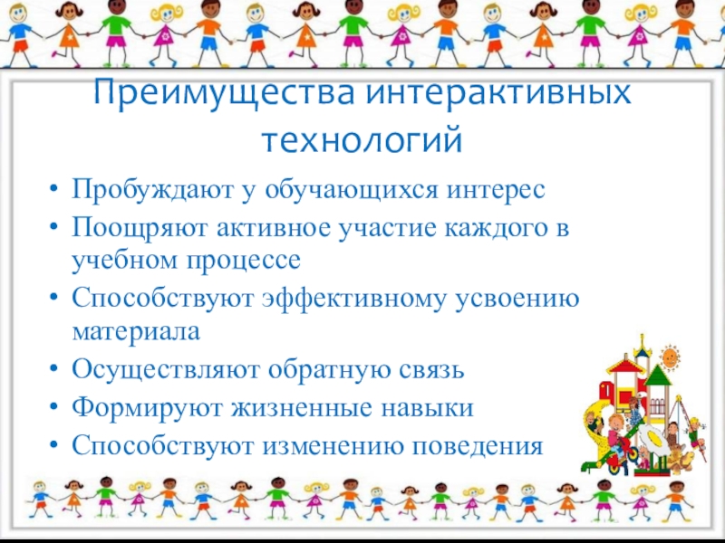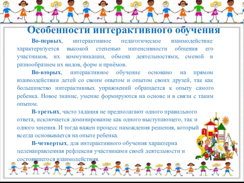 Во-вторых, интерактивное обучение основано на прямом взаимодействии детей со своим опытом и опытом своих друзей, так как большинство интерактивных упражнений обращается к опыту самого ребенка. Новое знание, умение формируются на основе и в связи с таким опытом.