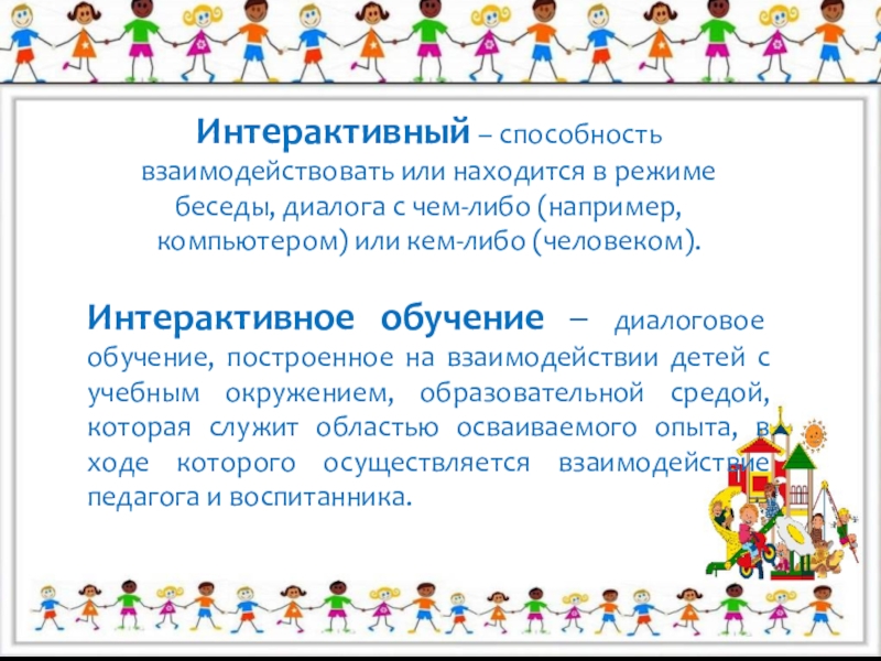 Интерактивное обучение – диалоговое обучение, построенное на взаимодействии детей с учебным окружением, образовательной средой, которая служит областью осваиваемого опыта, в ходе которого осуществляется взаимодействие педагога и воспитанника.