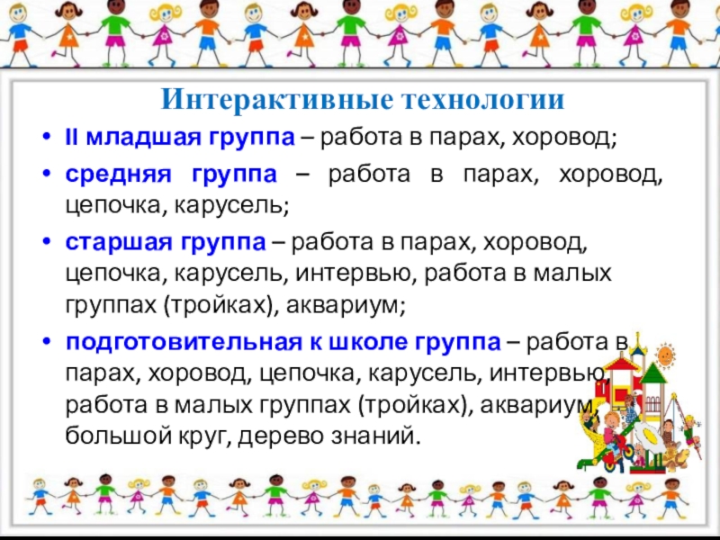 подготовительная к школе группа – работа в парах, хоровод, цепочка, карусель, интервью, работа в малых группах (тройках), аквариум, большой круг, дерево знаний.