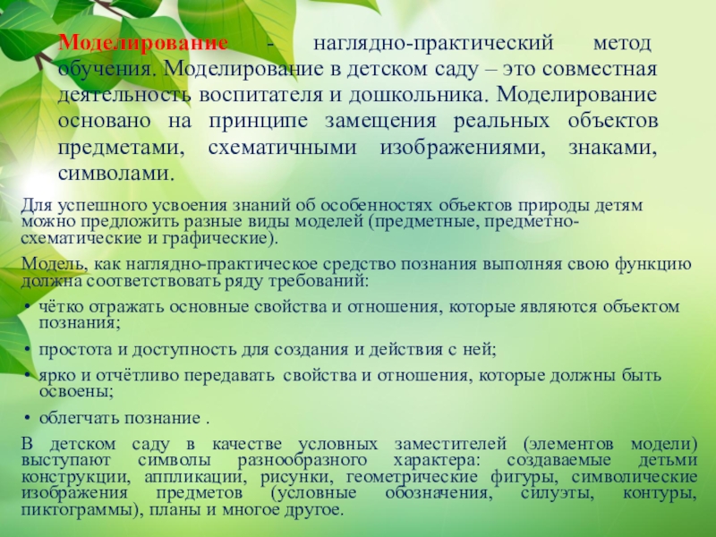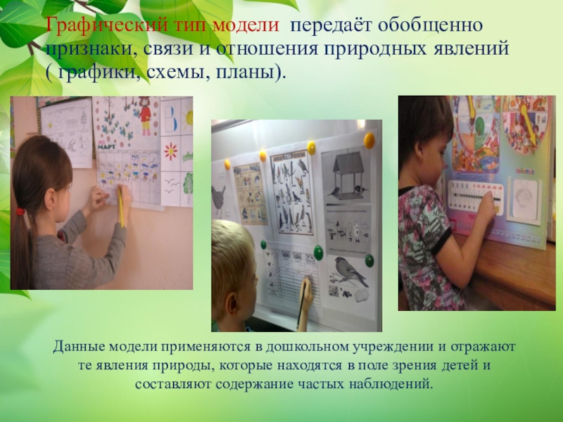 Для успешного усвоения знаний об особенностях объектов природы детям можно предложить разные виды моделей (предметные, предметно-схематические и графические).