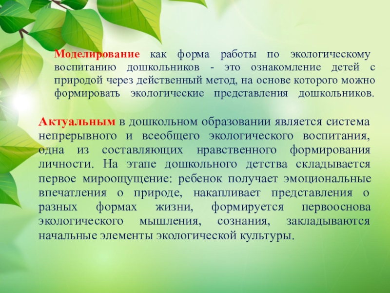 Актуальным в дошкольном образовании является система непрерывного и всеобщего экологического воспитания, одна из составляющих нравственного формирования личности. На этапе дошкольного детства складывается первое мироощущение: ребенок получает эмоциональные впечатления о природе, накапливает представления о разных формах жизни, формируется первооснова экологического мышления, сознания, закладываются начальные элементы экологической культуры.