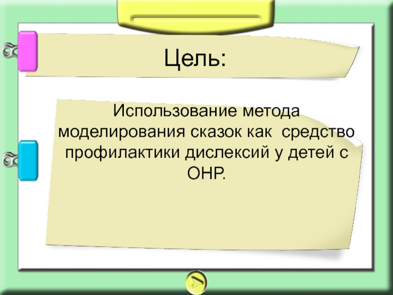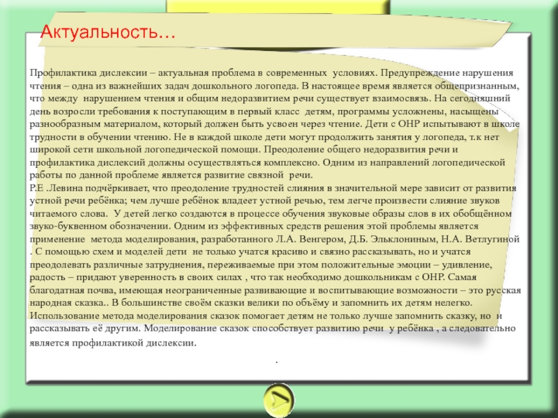 Р.Е .Левина подчёркивает, что преодоление трудностей слияния в значительной мере зависит от развития устной речи ребёнка; чем лучше ребёнок владеет устной речью, тем легче произвести слияние звуков читаемого слова. У детей легко создаются в процессе обучения звуковые образы слов в их обобщённом звуко-буквенном обозначении. Одним из эффективных средств решения этой проблемы является применение метода моделирования, разработанного Л.А. Венгером, Д.Б. Эльклониным, Н.А. Ветлугиной . С помощью схем и моделей дети не только учатся красиво и связно рассказывать, но и учатся преодолевать различные затруднения, переживаемые при этом положительные эмоции – удивление, радость – придают уверенность в своих силах , что так необходимо дошкольникам с ОНР. Самая благодатная почва, имеющая неограниченные развивающие и воспитывающие возможности – это русская народная сказка.. В большинстве своём сказки велики по объёму и запомнить их детям нелегко. Использование метода моделирования сказок помогает детям не только лучше запомнить сказку, но и рассказывать её другим. Моделирование сказок способствует развитию речи у ребёнка , а следовательно является профилактикой дислексии.
