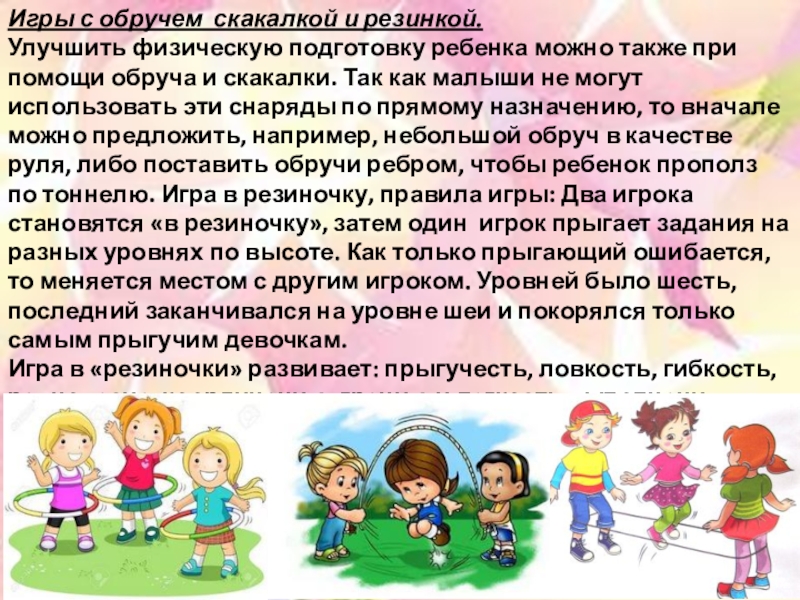 при помощи обруча и скакалки. Так как малыши не могут использовать эти снаряды по прямому назначению, то вначале можно предложить, например, небольшой обруч в качестве руля, либо поставить обручи ребром, чтобы ребенок прополз по тоннелю. Игра в резиночку, правила игры: Два игрока становятся «в резиночку», затем один игрок прыгает задания на разных уровнях по высоте. Как только прыгающий ошибается, то меняется местом с другим игроком. Уровней было шесть, последний заканчивался на уровне шеи и покорялся только самым прыгучим девочкам.