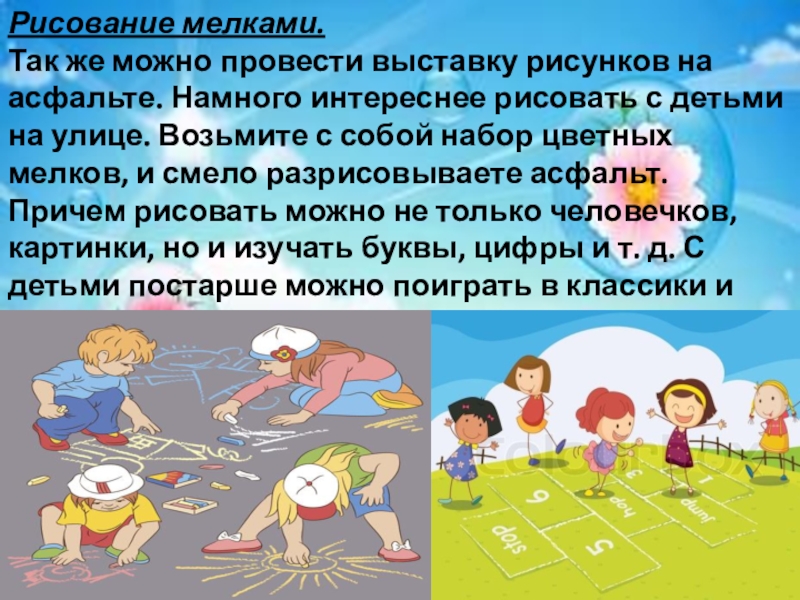 рисовать с детьми на улице. Возьмите с собой набор цветных мелков, и смело разрисовываете асфальт. Причем рисовать можно не только человечков, картинки, но и изучать буквы, цифры и т. д. С детьми постарше можно поиграть в классики и другие аналогичные игры.
