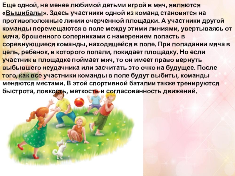 Слайд 14Еще одной, не менее любимой детьми игрой в мяч, являются «Вышибалы».