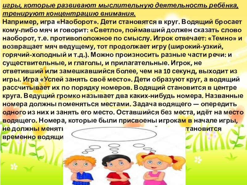 Дети становятся в круг. Водящий бросает кому-либо мяч и говорит: «Светло», поймавший должен сказать слово наоборот, т.е. противоположное по смыслу. Игрок отвечает: «Темно» и возвращает мяч ведущему, тот продолжает игру (широкий-узкий, горячий-холодный и т.д.). Можно произносить разные части речи: и существительные, и глаголы, и прилагательные. Игрок, не ответивший или замешкавшийся более, чем на 10 секунд, выходит из игры. Игра «Успей занять своё место». Дети образуют круг, а водящий рассчитывает их по порядку номеров. Водящий становится в центре круга. Ведущий громко называет два каких-нибудь номера. Названные номера должны поменяться местами. Задача водящего — опередить одного из них и занять его место. Оставшийся без места, идёт на место водящего. Номера, которые были присвоены игрокам в начале игры, не должны меняться, даже когда тот или иной из них становится временно водящим.