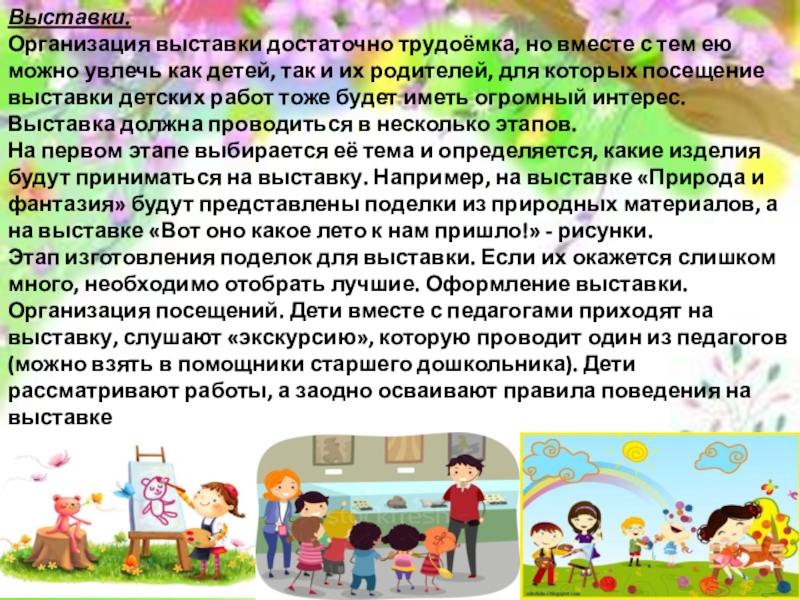 Этап изготовления поделок для выставки. Если их окажется слишком много, необходимо отобрать лучшие. Оформление выставки. Организация посещений. Дети вместе с педагогами приходят на выставку, слушают «экскурсию», которую проводит один из педагогов (можно взять в помощники старшего дошкольника). Дети рассматривают работы, а заодно осваивают правила поведения на выставке