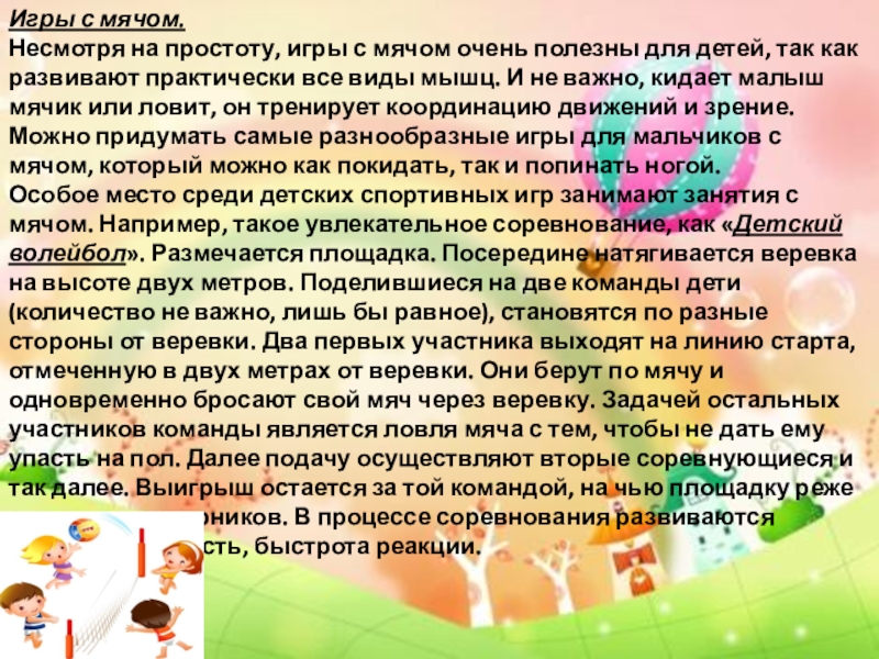 Особое место среди детских спортивных игр занимают занятия с мячом. Например, такое увлекательное соревнование, как «Детский волейбол». Размечается площадка. Посередине натягивается веревка на высоте двух метров. Поделившиеся на две команды дети (количество не важно, лишь бы равное), становятся по разные стороны от веревки. Два первых участника выходят на линию старта, отмеченную в двух метрах от веревки. Они берут по мячу и одновременно бросают свой мяч через веревку. Задачей остальных участников команды является ловля мяча с тем, чтобы не дать ему упасть на пол. Далее подачу осуществляют вторые соревнующиеся и так далее. Выигрыш остается за той командой, на чью площадку реже падал мяч соперников. В процессе соревнования развиваются ловкость, меткость, быстрота реакции.