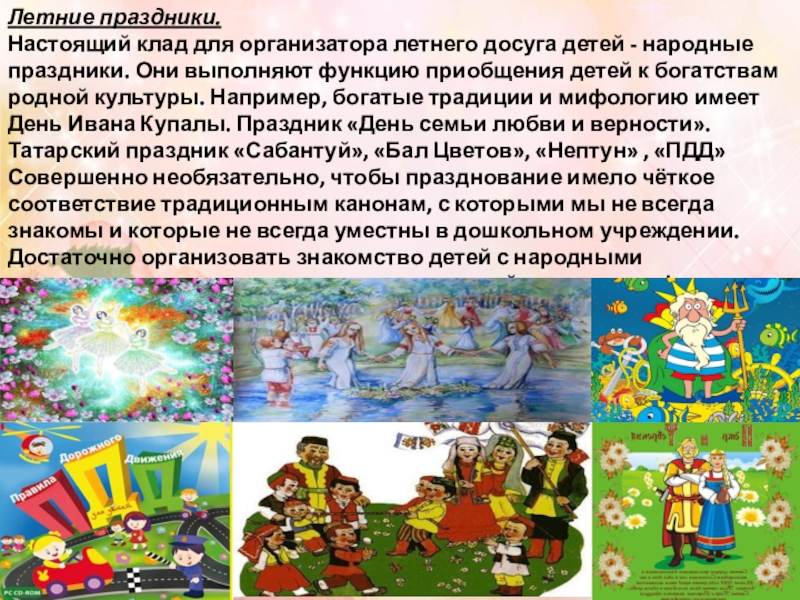 Они выполняют функцию приобщения детей к богатствам родной культуры. Например, богатые традиции и мифологию имеет День Ивана Купалы. Праздник «День семьи любви и верности». Татарский праздник «Сабантуй», «Бал Цветов», «Нептун» , «ПДД» Совершенно необязательно, чтобы празднование имело чёткое соответствие традиционным канонам, с которыми мы не всегда знакомы и которые не всегда уместны в дошкольном учреждении. Достаточно организовать знакомство детей с народными культурными традициями в соответствующей их возрасту форме.