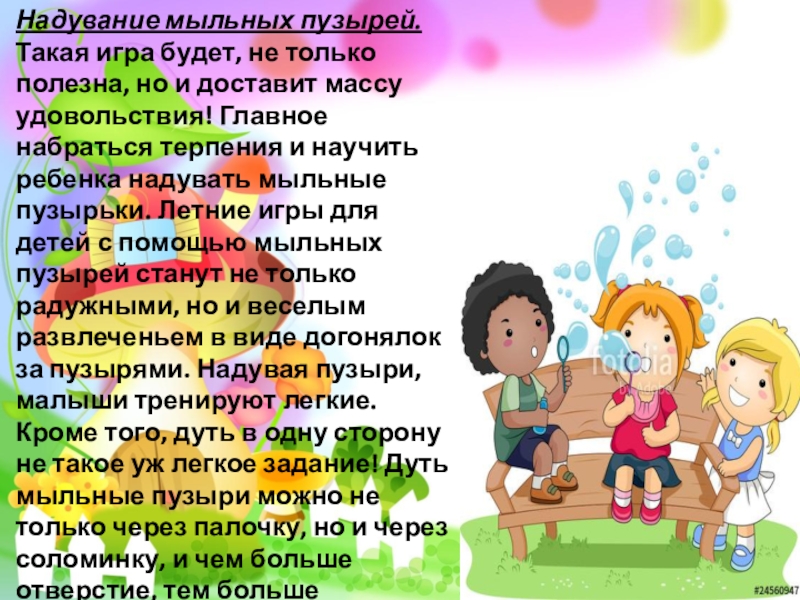 массу удовольствия! Главное набраться терпения и научить ребенка надувать мыльные пузырьки. Летние игры для детей с помощью мыльных пузырей станут не только радужными, но и веселым развлеченьем в виде догонялок за пузырями. Надувая пузыри, малыши тренируют легкие. Кроме того, дуть в одну сторону не такое уж легкое задание! Дуть мыльные пузыри можно не только через палочку, но и через соломинку, и чем больше отверстие, тем больше получатся пузыри.