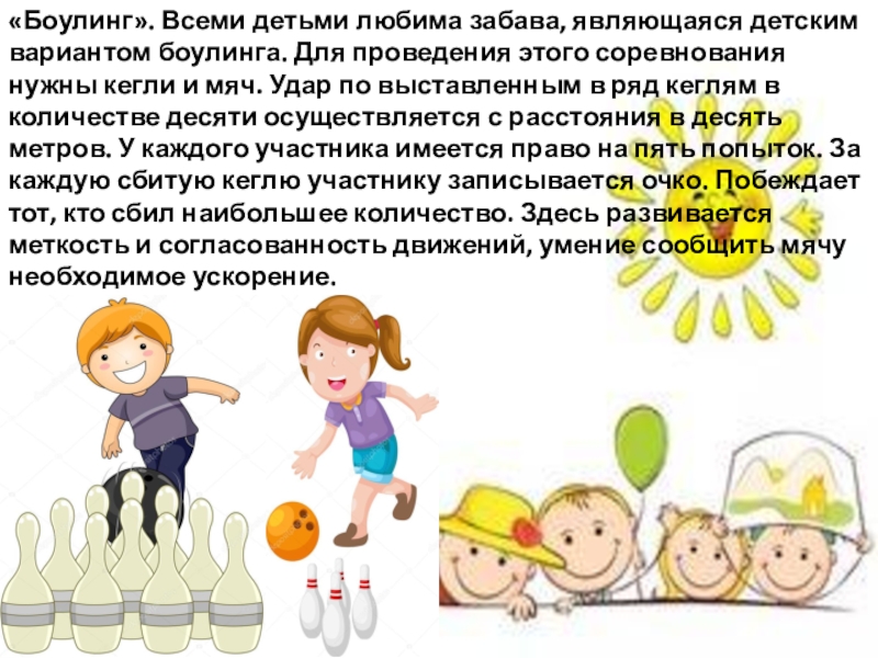 Слайд 15«Боулинг». Всеми детьми любима забава, являющаяся детским вариантом боулинга. Для проведения