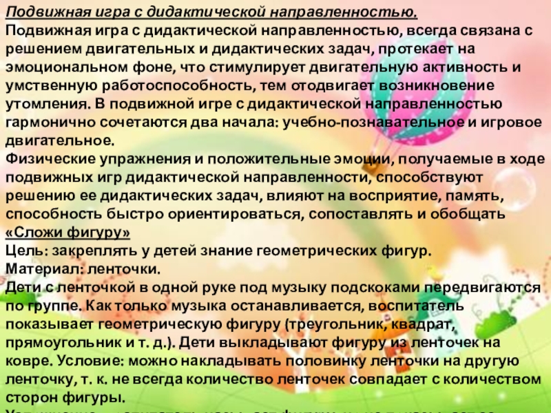 с решением двигательных и дидактических задач, протекает на эмоциональном фоне, что стимулирует двигательную активность и умственную работоспособность, тем отодвигает возникновение утомления. В подвижной игре с дидактической направленностью гармонично сочетаются два начала: учебно-познавательное и игровое двигательное.