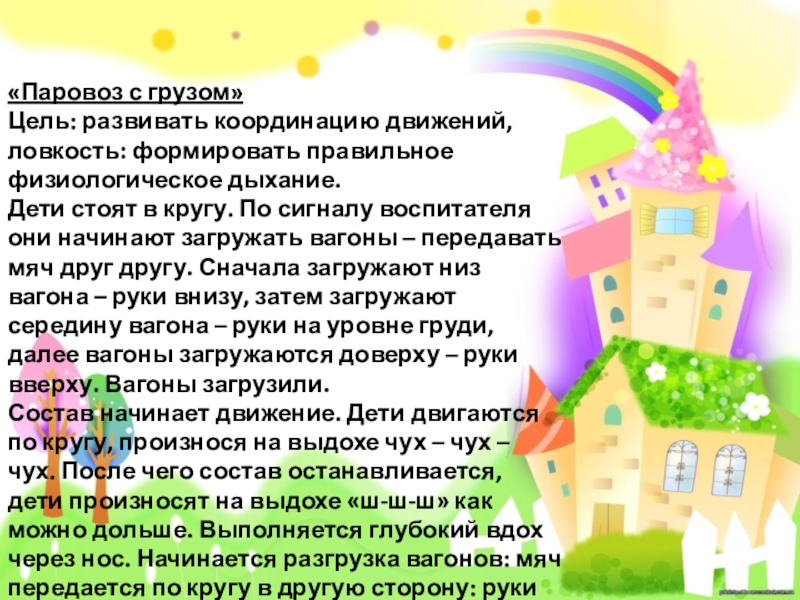 Состав начинает движение. Дети двигаются по кругу, произнося на выдохе чух – чух – чух. После чего состав останавливается, дети произносят на выдохе «ш-ш-ш» как можно дольше. Выполняется глубокий вдох через нос. Начинается разгрузка вагонов: мяч передается по кругу в другую сторону: руки вверху, на уровне груди, внизу.