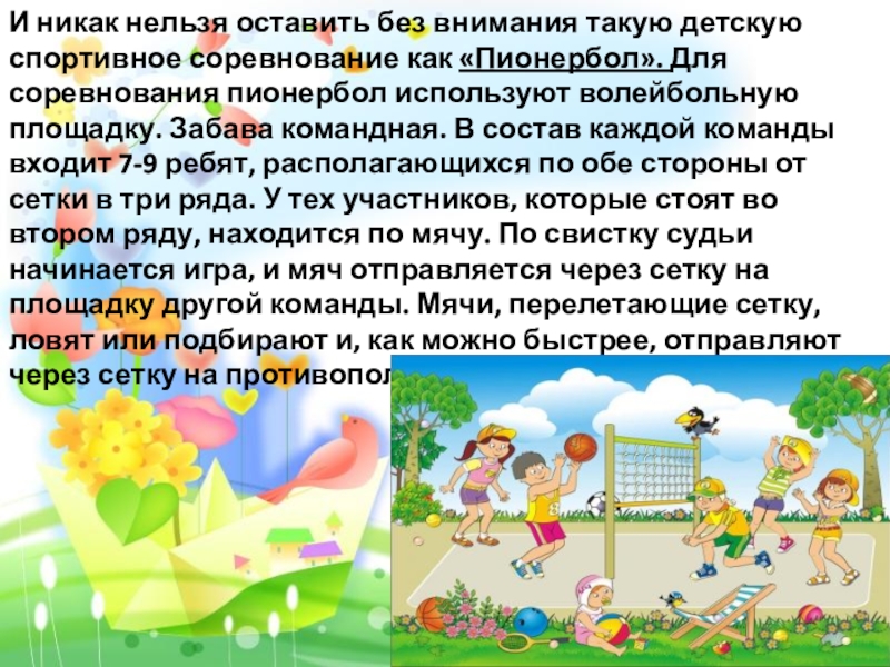 «Пионербол». Для соревнования пионербол используют волейбольную площадку. Забава командная. В состав каждой команды входит 7-9 ребят, располагающихся по обе стороны от сетки в три ряда. У тех участников, которые стоят во втором ряду, находится по мячу. По свистку судьи начинается игра, и мяч отправляется через сетку на площадку другой команды. Мячи, перелетающие сетку, ловят или подбирают и, как можно быстрее, отправляют через сетку на противоположную сторону