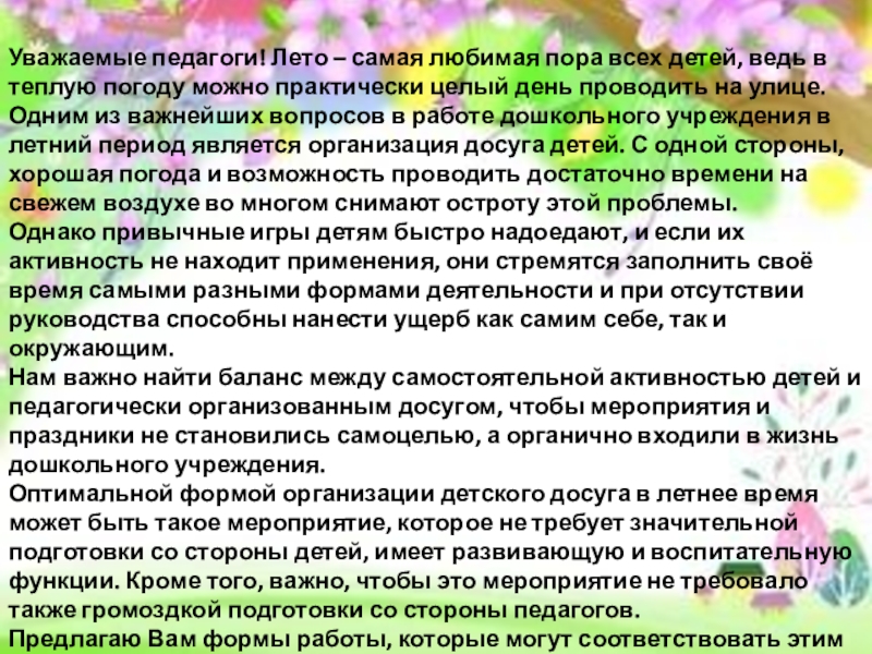 Слайд 3Уважаемые педагоги! Лето – самая любимая пора всех детей, ведь в
