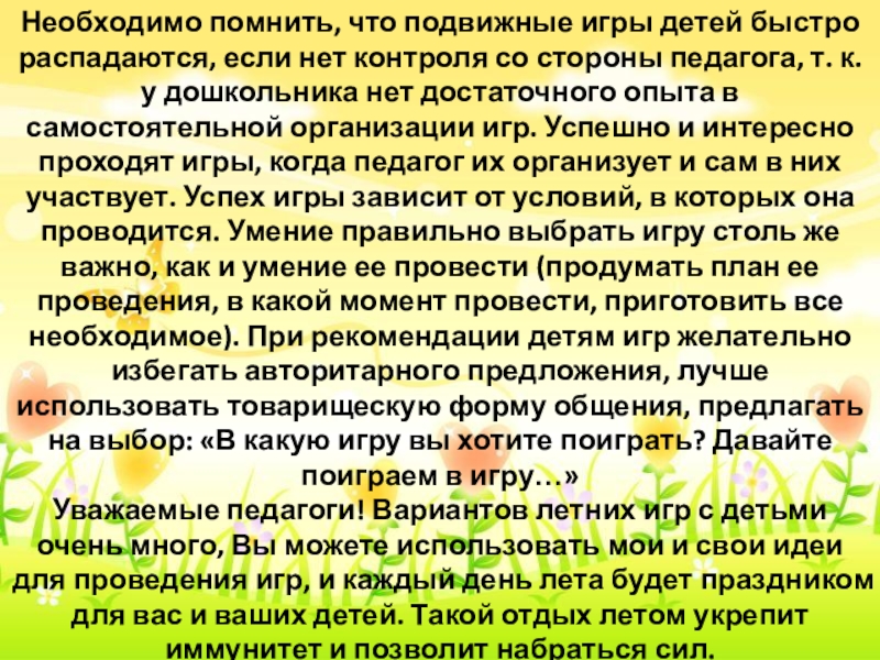 Уважаемые педагоги! Вариантов летних игр с детьми очень много, Вы можете использовать мои и свои идеи для проведения игр, и каждый день лета будет праздником для вас и ваших детей. Такой отдых летом укрепит иммунитет и позволит набраться сил.