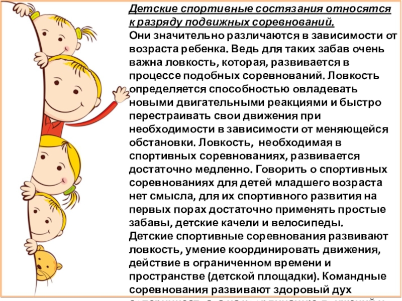 Слайд 11Детские спортивные состязания относятся к разряду подвижных соревнований.