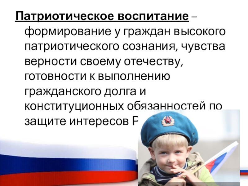 Слайд 13Патриотическое воспитание – формирование у граждан высокого патриотического сознания, чувства верности своему