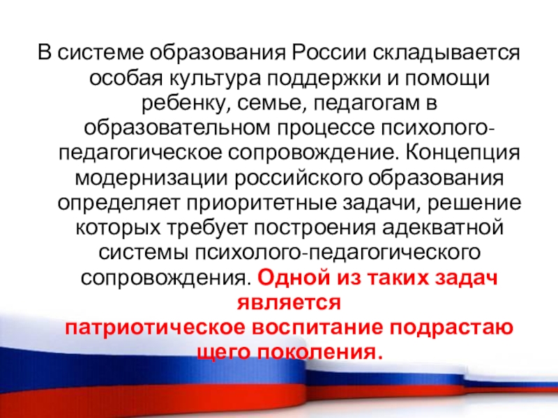 семье, педагогам в образовательном процессе психолого-педагогическое сопровождение. Концепция модернизации российского образования определяет приоритетные задачи, решение которых требует построения адекватной системы психолого-педагогического сопровождения. Одной из таких задач является патриотическое воспитание подрастающего поколения.