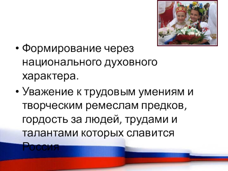 Слайд 6Формирование через национального духовного характера.
