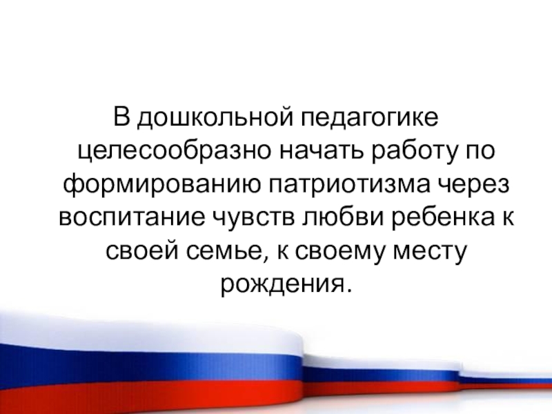 Слайд 16В дошкольной педагогике целесообразно начать работу по формированию патриотизма через воспитание