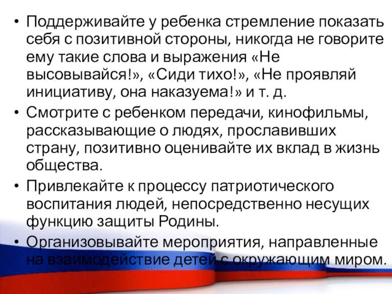Слайд 23Поддерживайте у ребенка стремление показать себя с позитивной стороны, никогда не