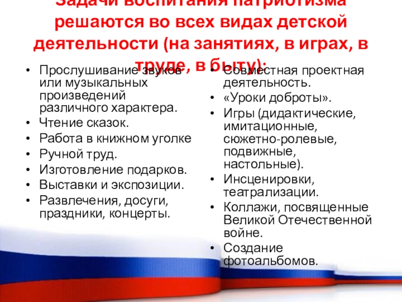 Слайд 20Задачи воспитания патриотизма решаются во всех видах детской деятельности (на занятиях,